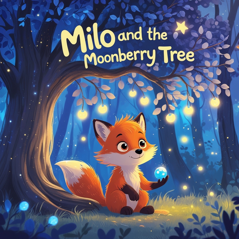 This children's book cover features a young fox named Milo sitting beneath a magical tree called the Moonberry Tree. Milo is about 6 years old (fox age), with fluffy orange fur, big round eyes full of curiosity, a small black nose, and a messy tuft of fur on top of his head that makes him look playful and endearing.